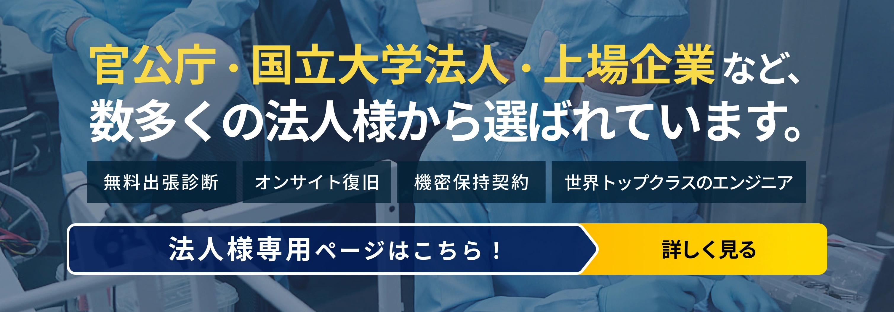 初期診断は「完全無料」です。 まずは機器の状態を確認し、復旧の可否やお見積り金額をご案内いたします。初期診断のみで費用が発生することは一切ありませんので、どうぞ安心してご相談ください。 ※宅配便でお預けいただき、復旧を行わずご返却となる場合は、返送料のみご負担いただいております。