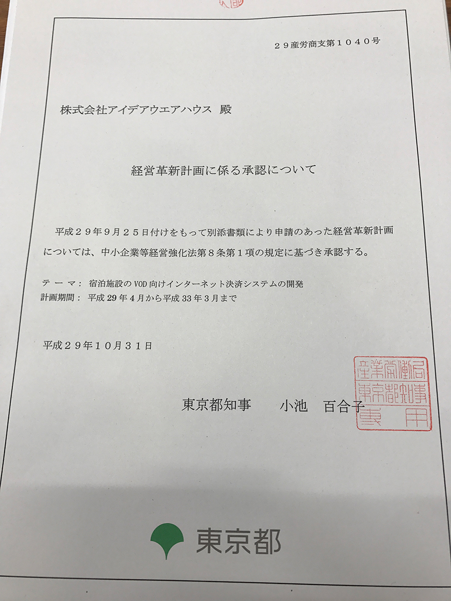 杉本様は、28年間に渡り複数の大手企業の情報システム関連部署で経験を積んだ後、4年前に株式会社アイデアウエアハウスを立ち上げて独立しました。業務内容はシステム開発の他、ビデオオンデマンドを得意とし、先日はビデオオンデマンドの決済を仕組み化し「東京都経営革新計画」に認定されました。インターネットでのカード決済をはじめ、電子マネー・コイン系の決済を工夫することで他社が出来ないサービスを提供し、ビデオオンデマンドの集金を「回収ではなく補充」という独自の工夫により新たな収益構造を創っております。