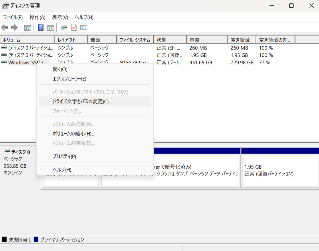 - 問題のあるドライブを右クリックし、「ドライブ文字とパスの変更」を選択