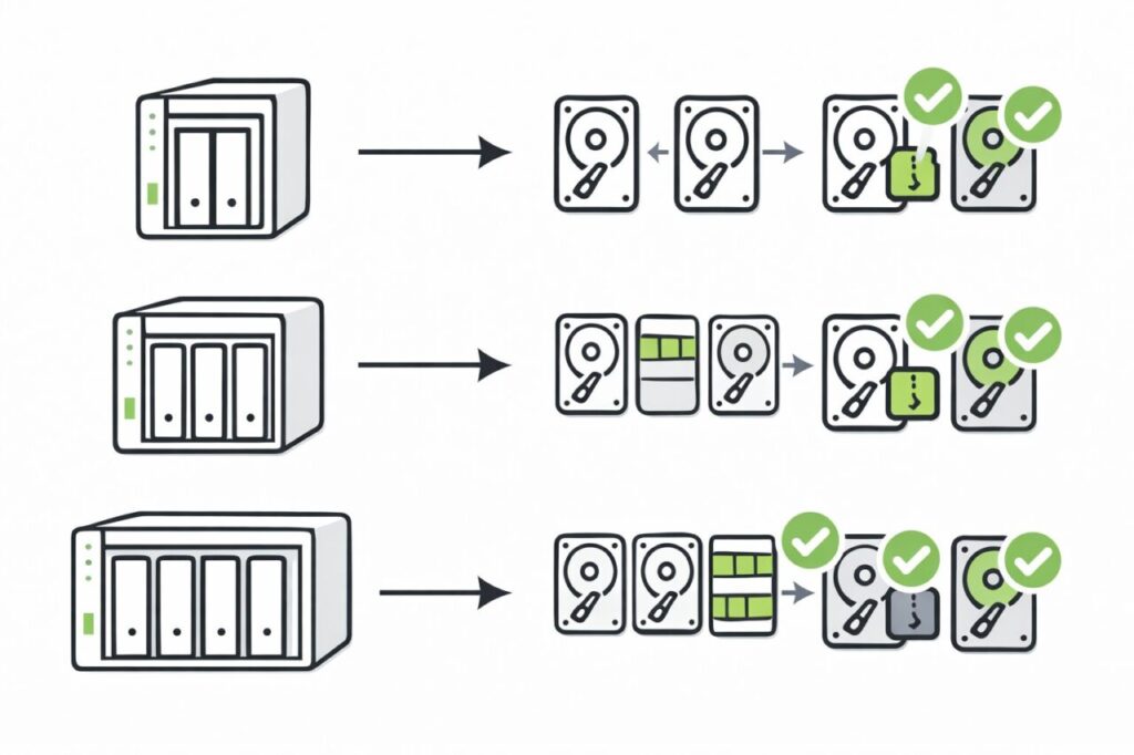 実際のNAS運用では、搭載できるHDDの数によって選ばれるRAID構成がある程度決まってきます。2ベイNASではRAID1が基本構成となり、4ベイNASではRAID5が最も一般的です。6ベイ以上になると安全性を重視してRAID6を採用するケースが増え、性能を優先する環境ではRAID10が選択されることもあります。