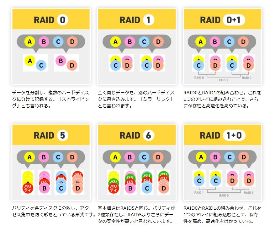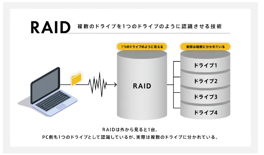 これにより、ひとつのユニットで大容量データを扱えるようになるほか、一部のディスクが故障しても、データの消失を防止することができます(これを冗長性といいます)。