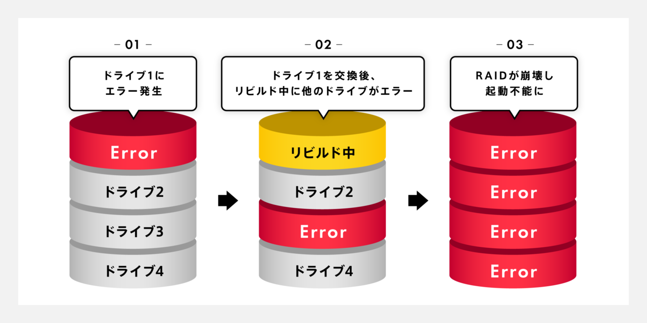 データを安定して保存できる仕組みとして知られるRAIDですが、過信は禁物です。RAIDを構成する各ドライブの寿命は平均して約5年程度とされており、経年劣化によって複数台のドライブが同時期に故障し、突然RAID崩壊が発生するケースも少なくありません。
