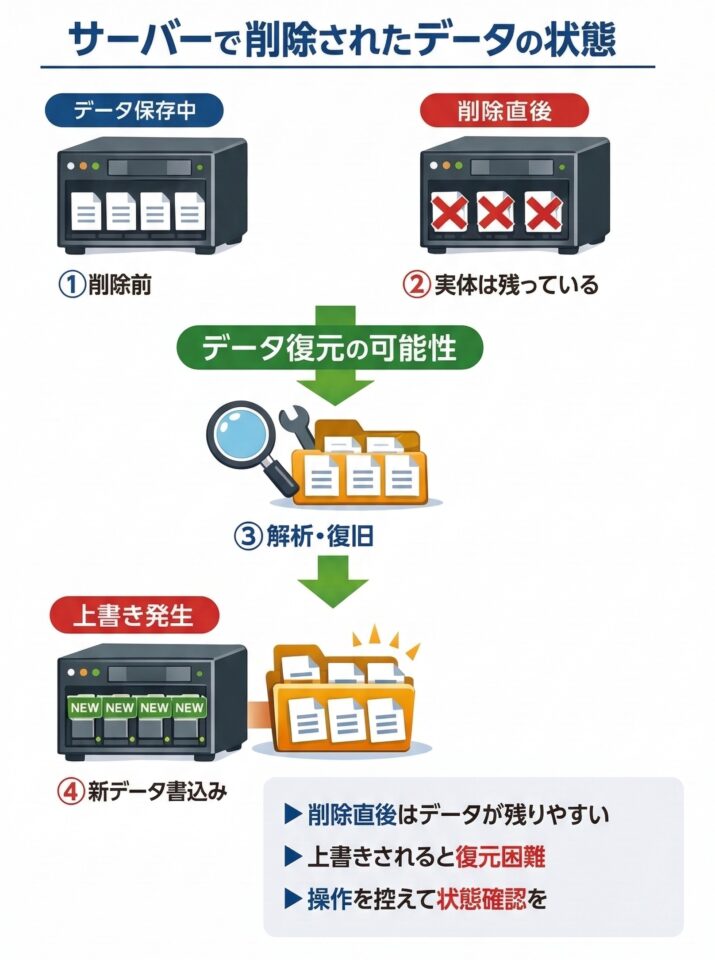 サーバー上のデータが削除された場合でも、必ずしも完全に消えているとは限りません。多くの場合、削除された直後はデータの実体がストレージ上に残っており、適切な手順で解析することで復元できる可能性があります。