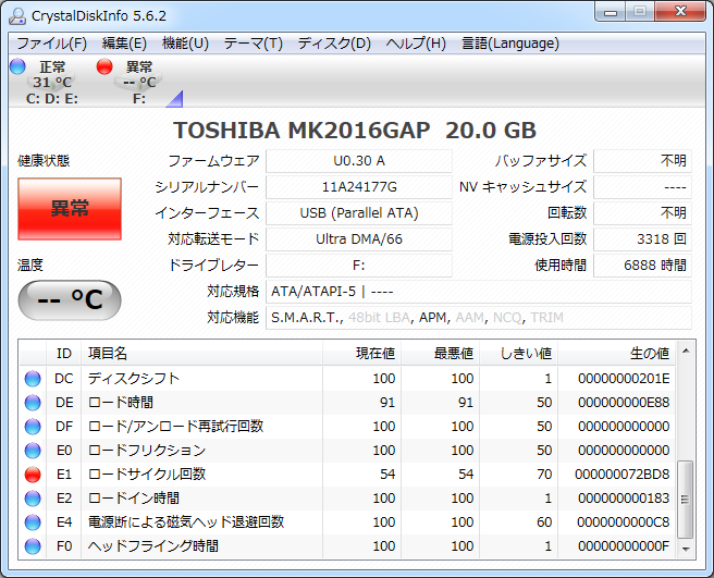 その下のS.M.A.R.T.項目から、特にC5(代替処理保留中のセクタ数)、C6(回復不可能セクタ数)、05(代替処理済のセクタ数)の値を確認します。黄色や赤色の表示、または数値が増加している場合は注意が必要です。