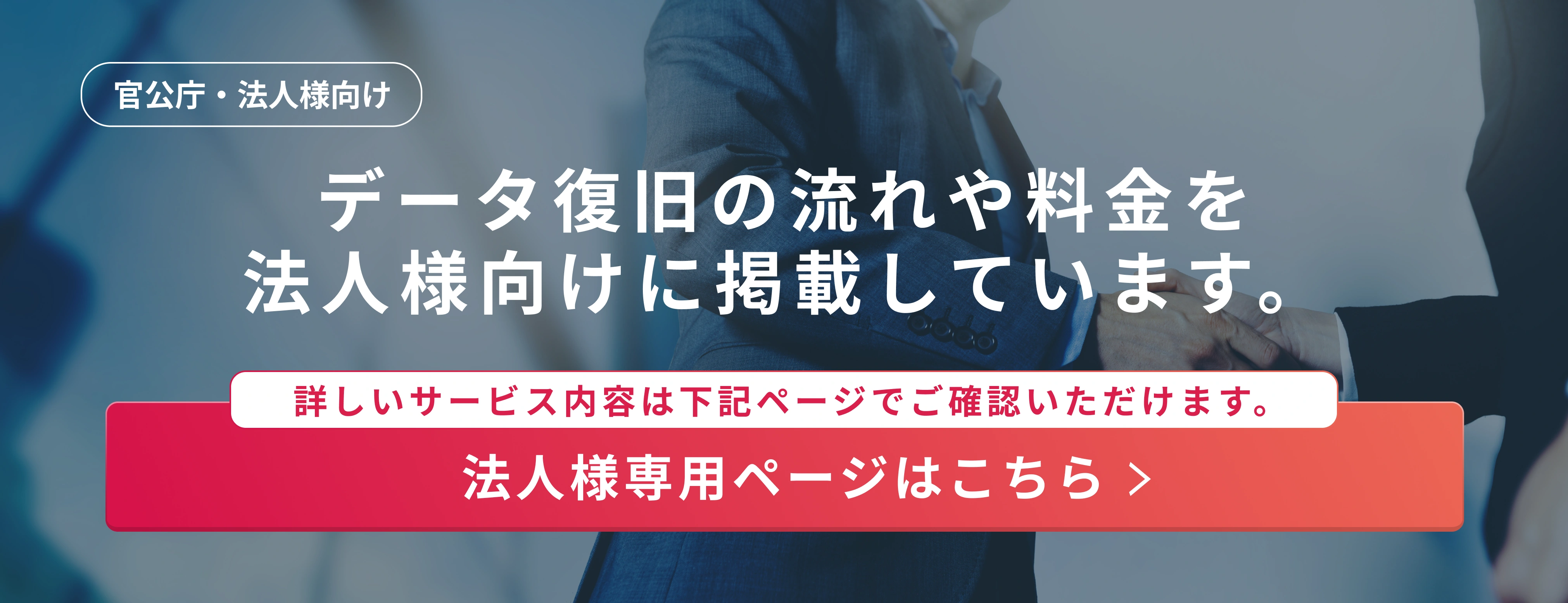 サーバやNASなど機器を社外に持ち出せない場合は、専門エンジニアによる出張訪問での診断・復旧にも対応しています。セキュリティ体制や復旧事例、よくある質問は、以下の法人向け専用ページにまとめています。業務データの復旧でお困りの際は、こちらもあわせてご覧ください。