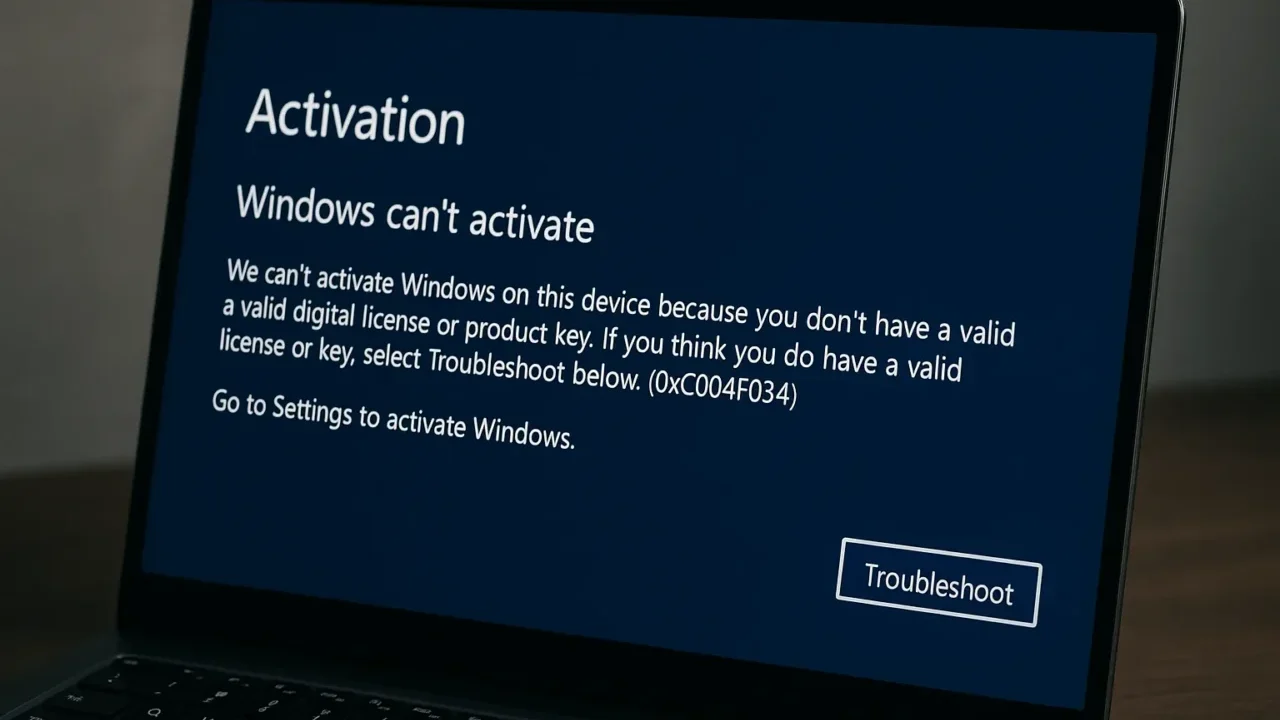 もっとも典型的な症状は、ライセンス認証の失敗です。「Windowsはライセンス認証されていません」や「このデバイスでWindowsのライセンス認証を行うことができません。後でもう一度実行するか、Microsoft Storeに移動して正規のWindowsを購入してください。エラーコード: 0xC004F034」などのメッセージが表示され、認証が完了しない状態になります。