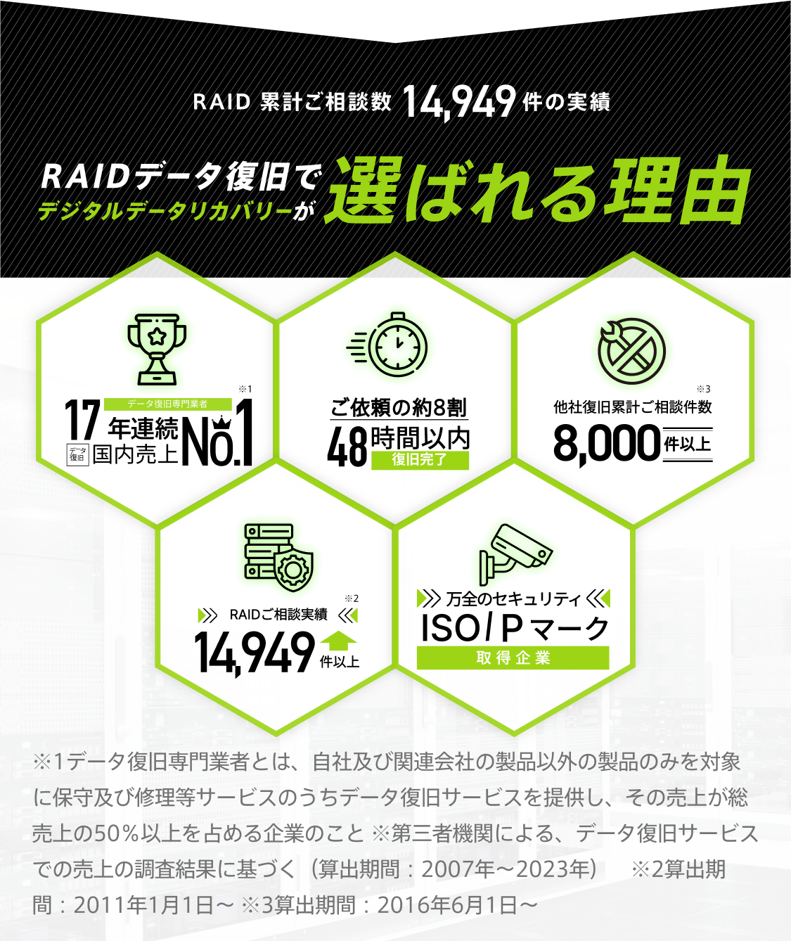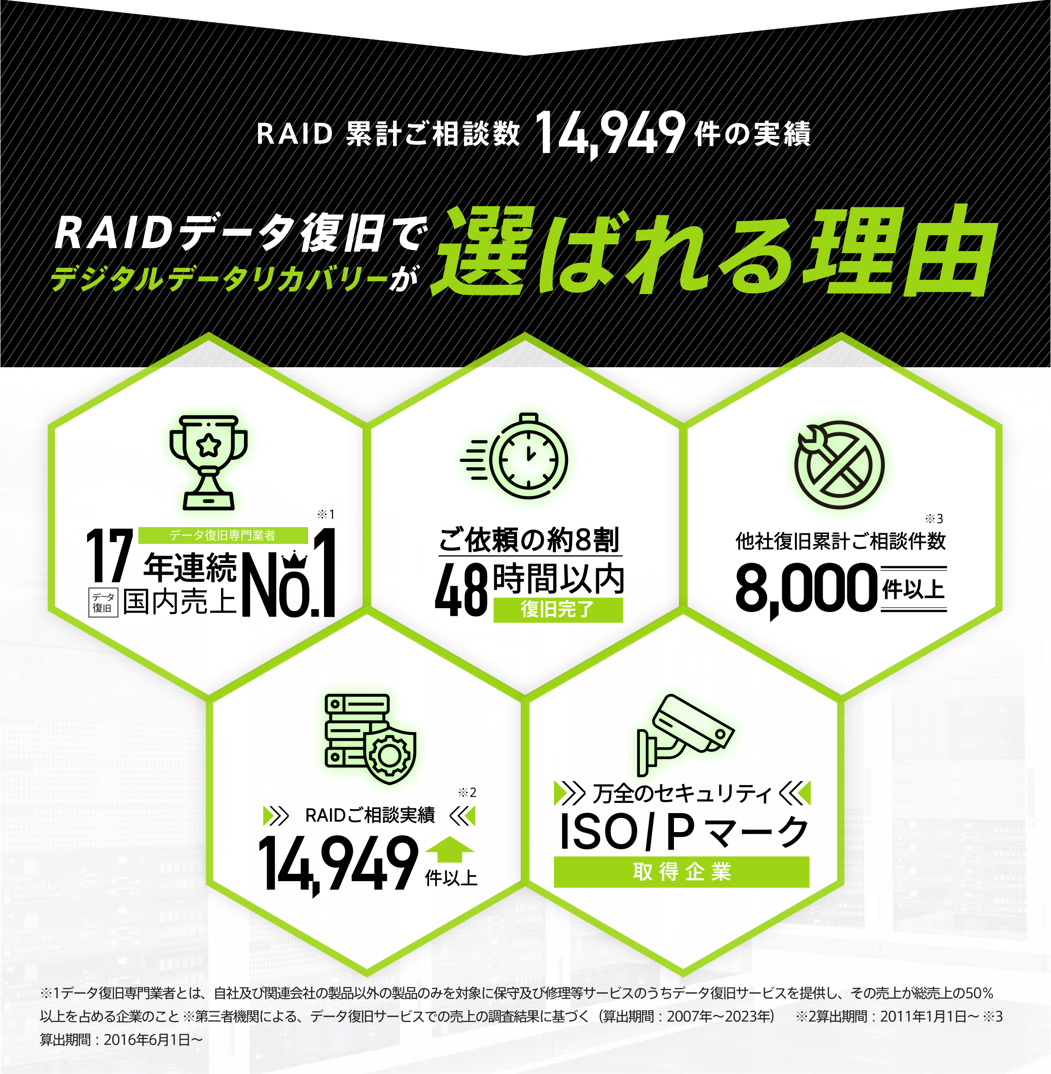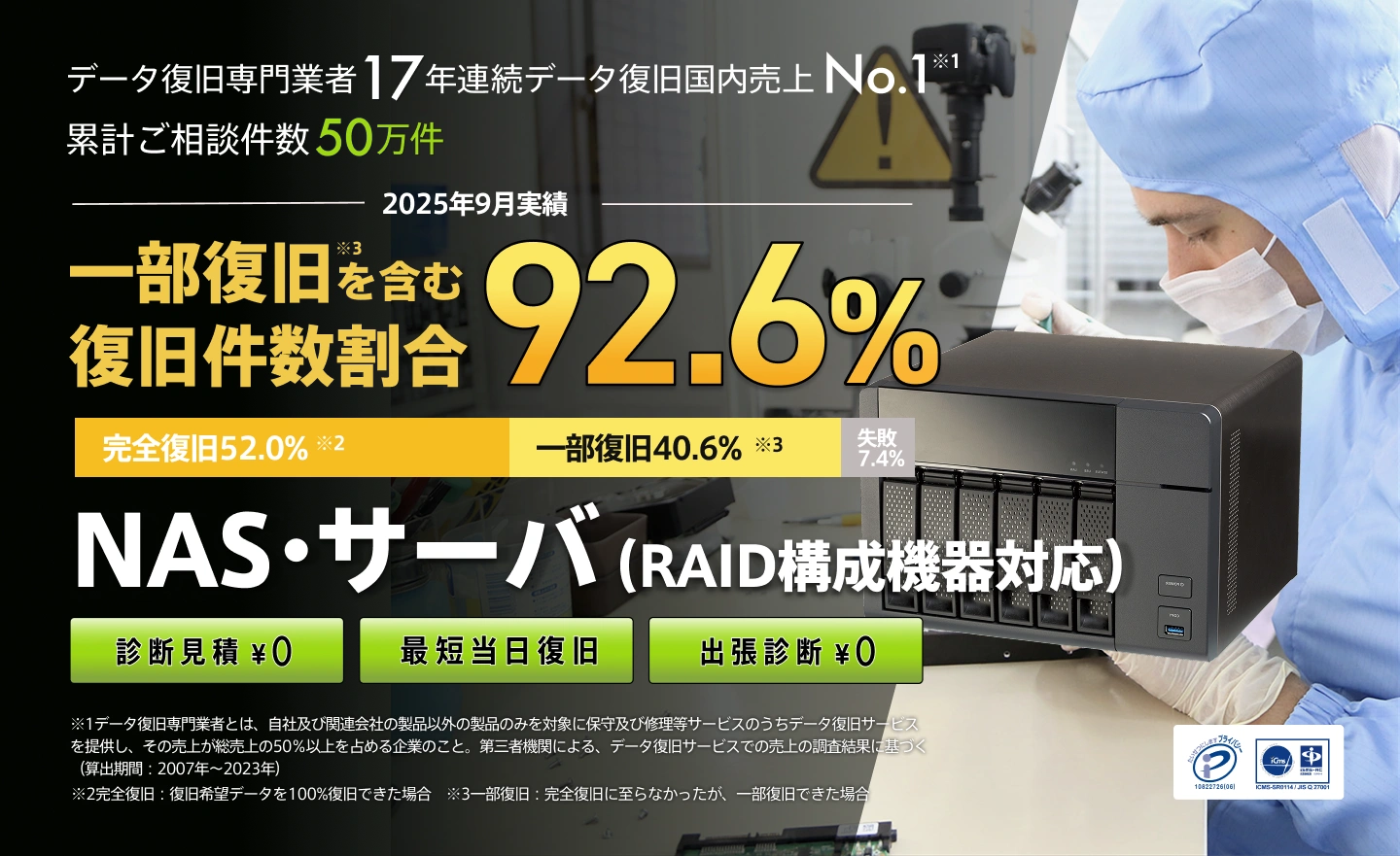 今回のように他社様が修理・復旧作業を行った結果、データの破損が進行する場合もあります。しかし当社では「復旧不可」「重度障害」と診断された場合でも、サーバーのデータ復旧のノウハウを元にデータ復旧できる可能性があります。保守業者・メーカー・当社以外のデータ復旧業者で復旧できない場合でもご相談ください。