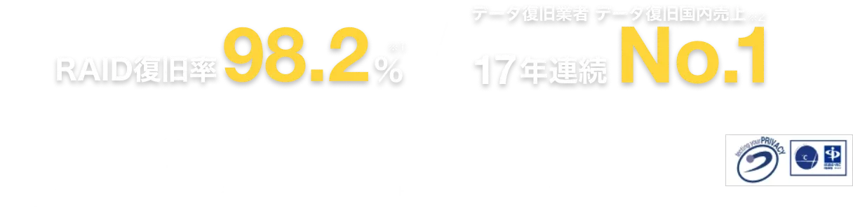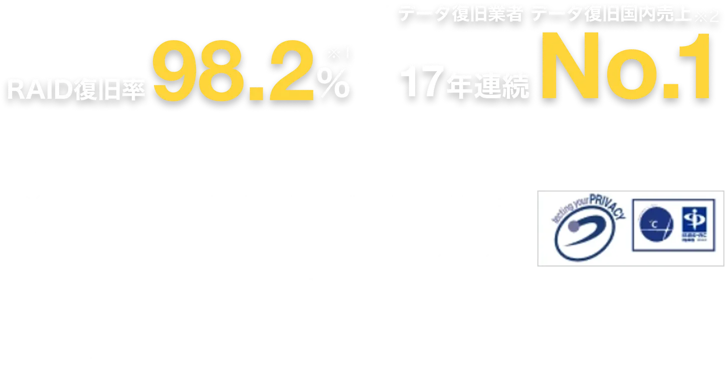 - データ復旧専門業者とは、自社及び関連会社の製品以外の製品のみを対象に保守及び修理等サービスのうちデータ復旧サービスを提供し、その売上が総売上の50%以上を占める企業のこと ※第三者機関による、データ復旧サービスでの売上の調査結果に基づく(算出期間:2007年~2023年)