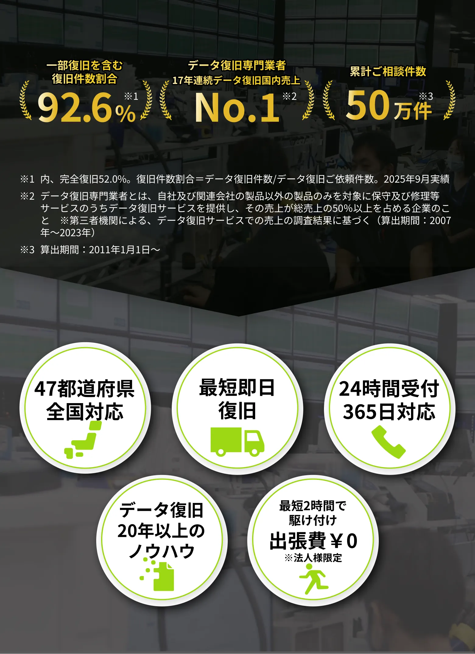 ※1 データ復旧専門業者とは、自社及び関連会社の製品以外の製品のみを対象に保守及び修理等サービスのうちデータ復旧サービスを提供し、その売上が総売上の50%以上を占める企業のこと ※第三者機関による、データ復旧サービスでの売上の調査結果に基づく(算出期間:2007年~2023年)