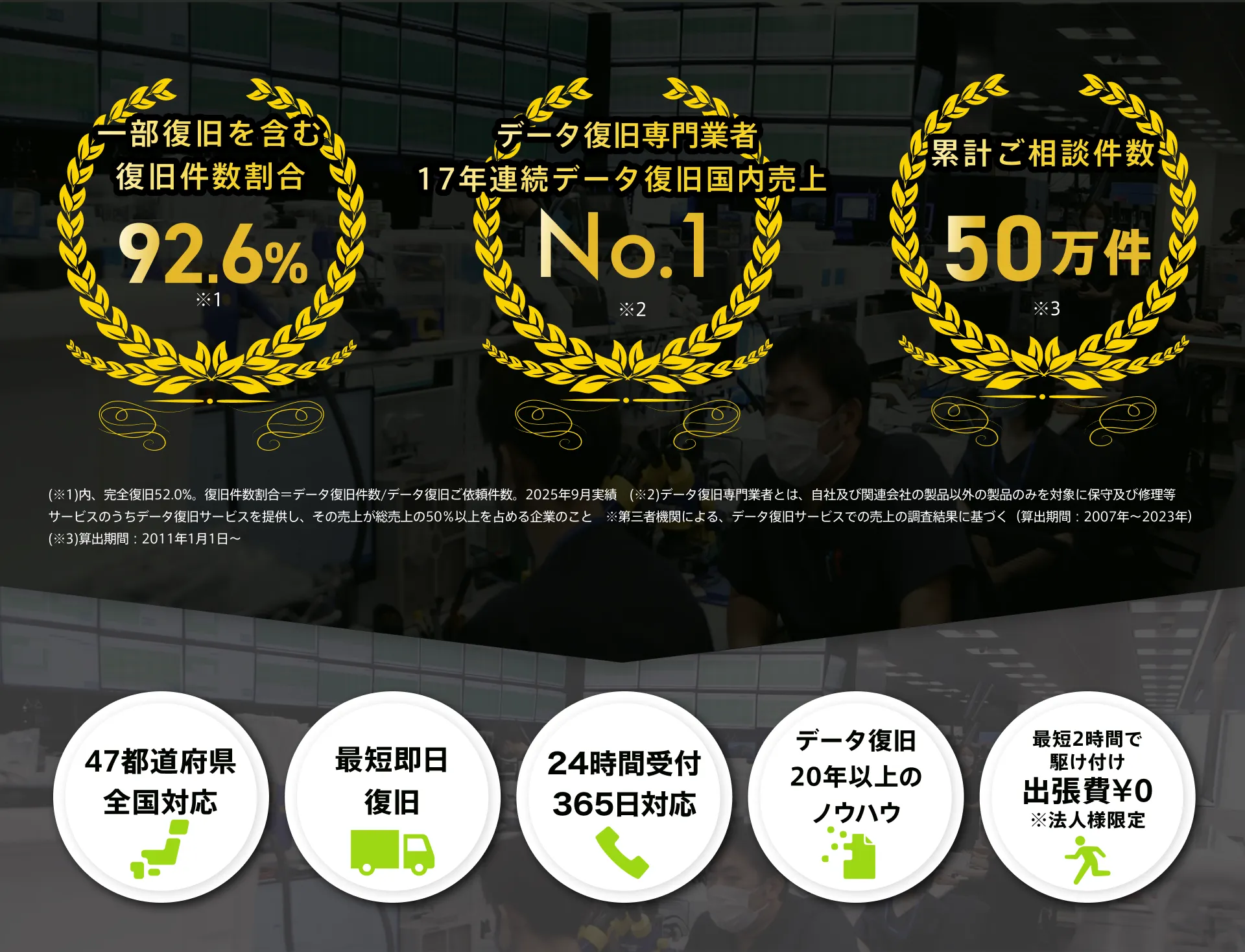 ※1 データ復旧専門業者とは、自社及び関連会社の製品以外の製品のみを対象に保守及び修理等サービスのうちデータ復旧サービスを提供し、その売上が総売上の50%以上を占める企業のこと ※第三者機関による、データ復旧サービスでの売上の調査結果に基づく(算出期間:2007年~2023年)
