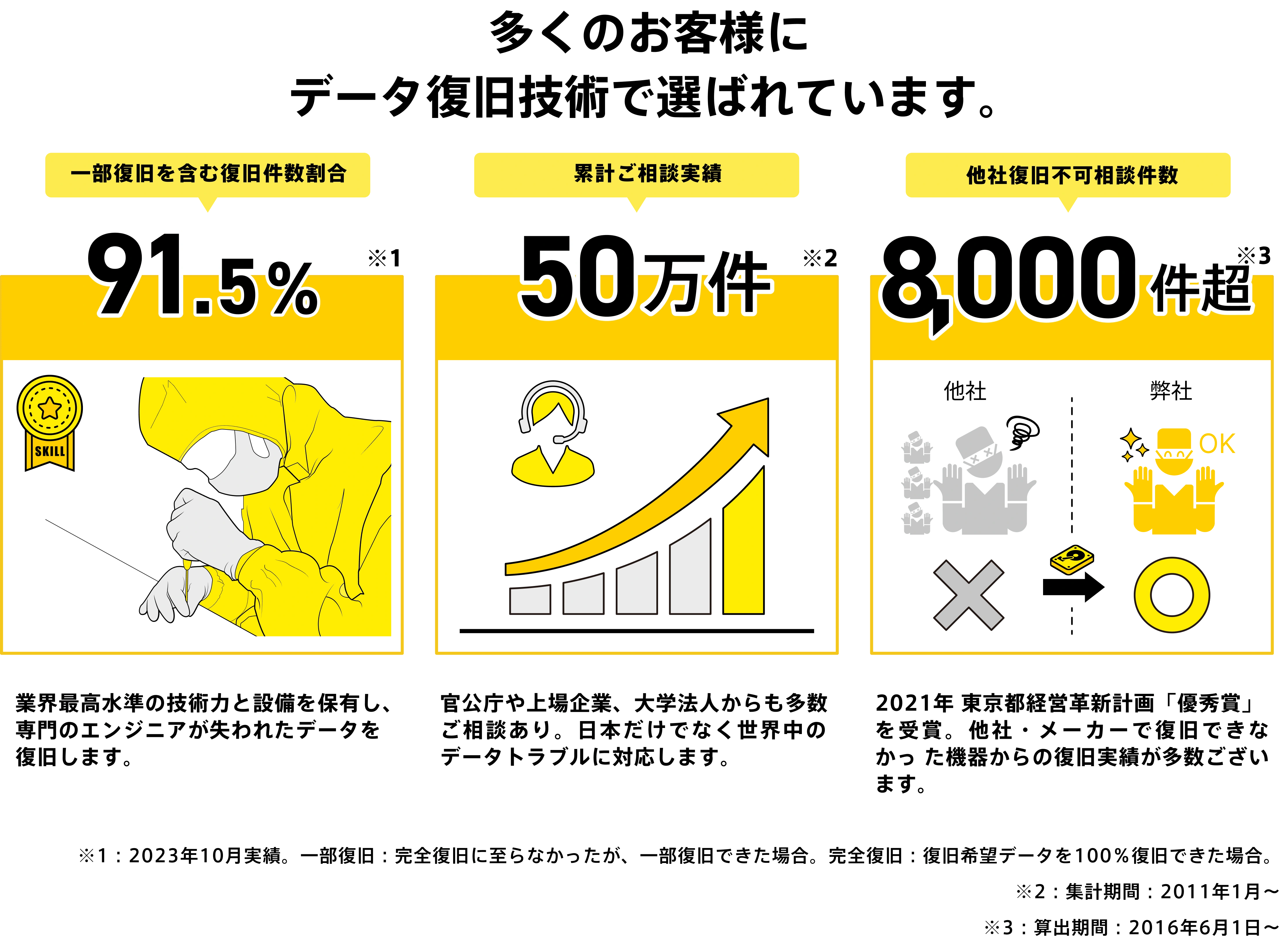 ※1:2023年10月実績。一部復旧:完全復旧に至らなかったが、一部復旧できた場合。完全復旧:復旧希望データを100%復旧できた場合。 詳しくはこちら