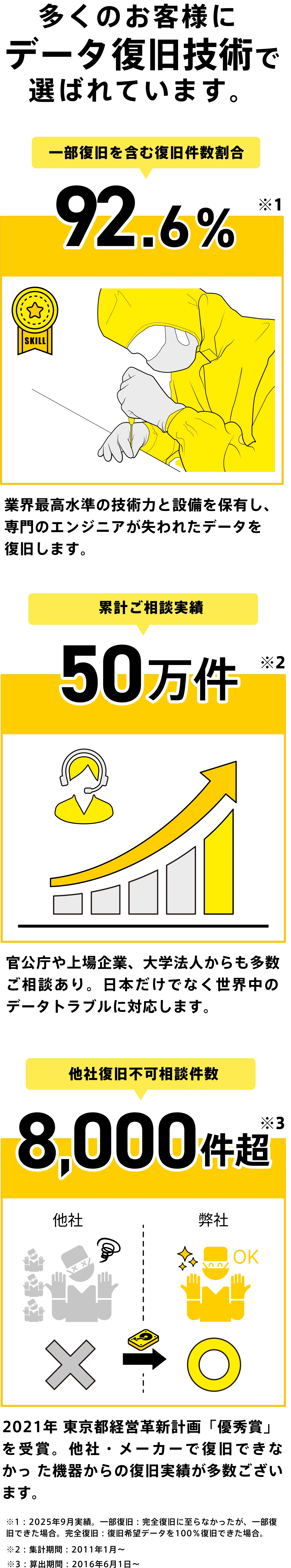 当社では、同業他社では復旧不可能とされた機器のご相談も8,000件以上(※3)対応しており、重度障害からのデータ復旧に多数成功しています。